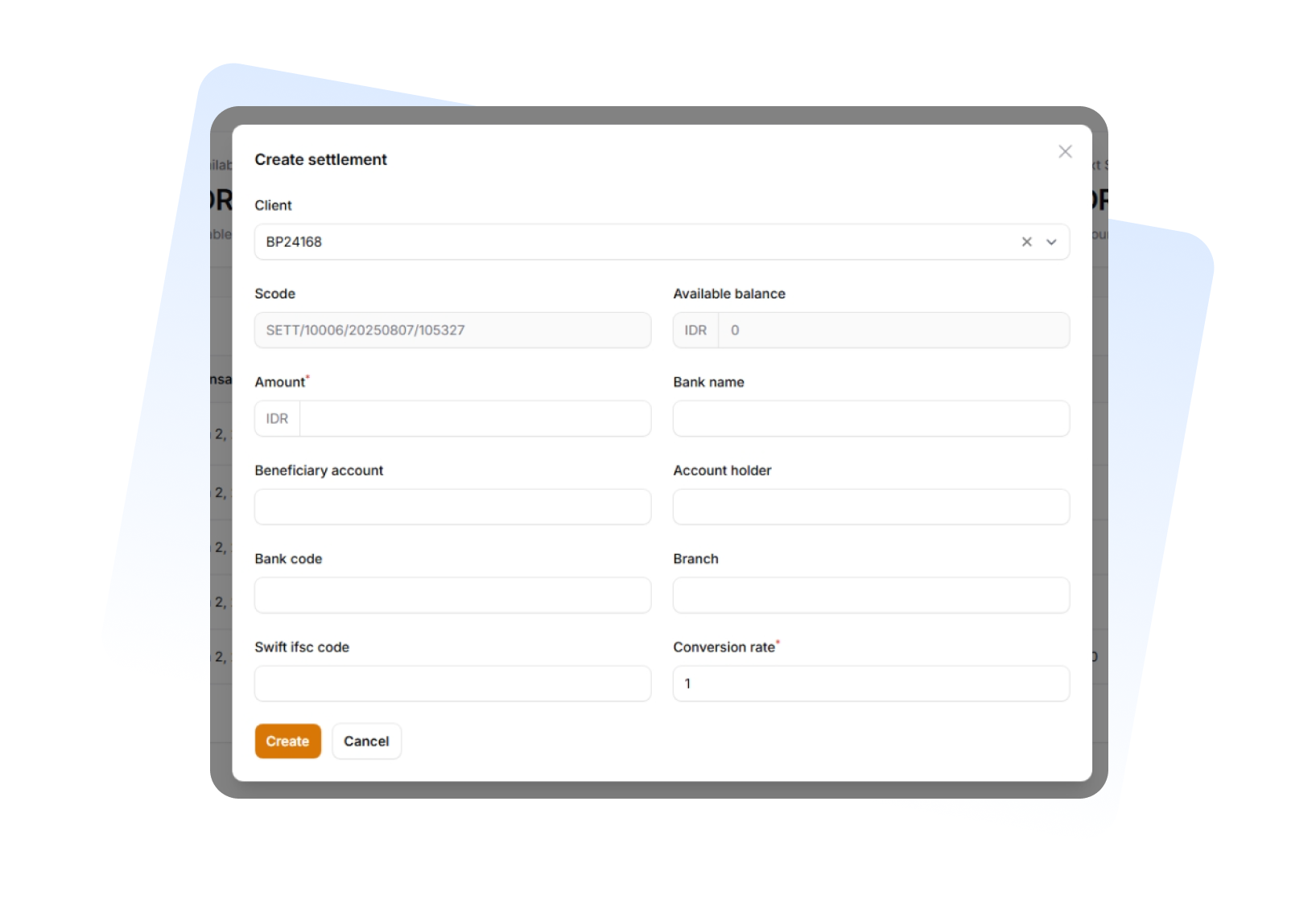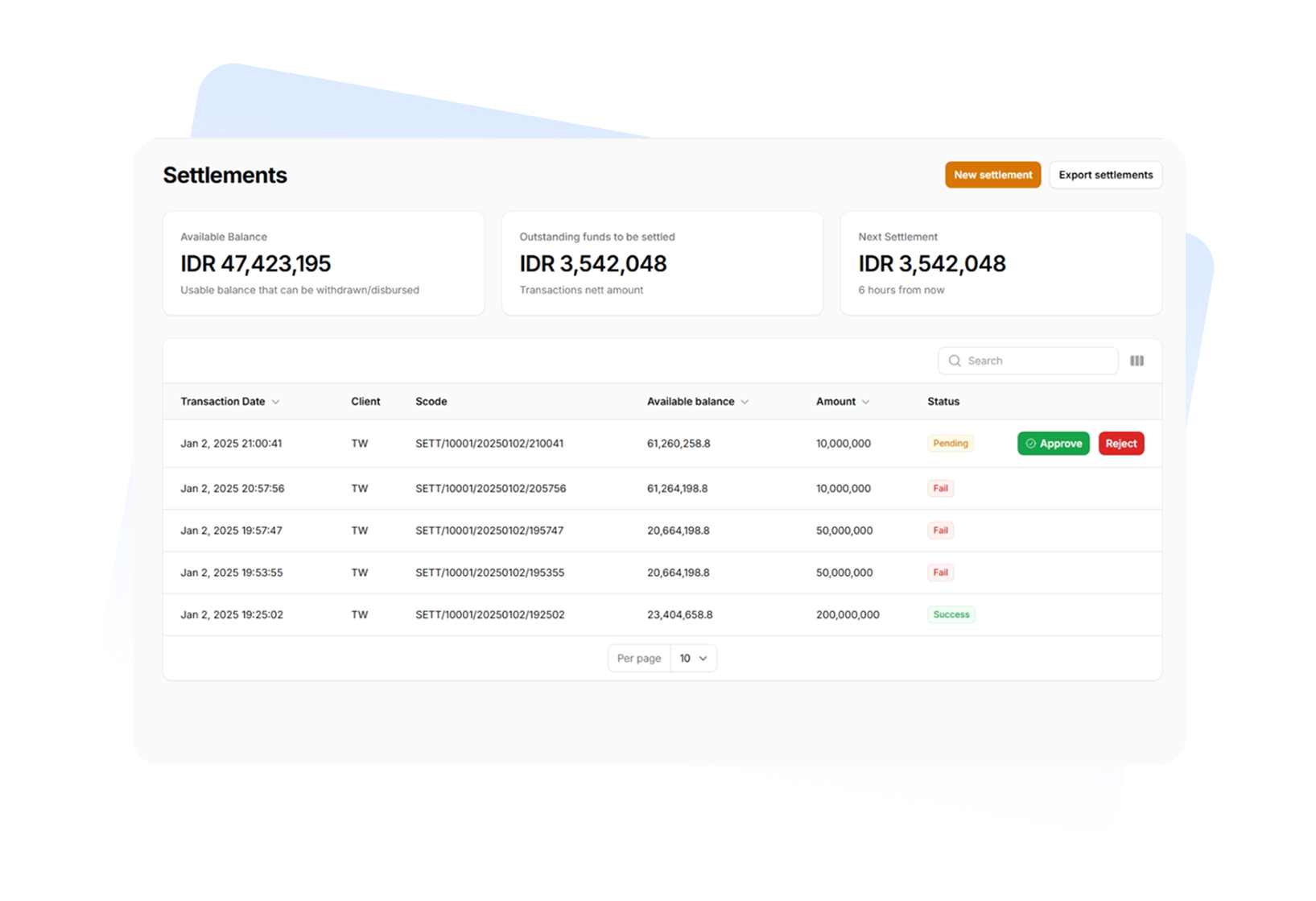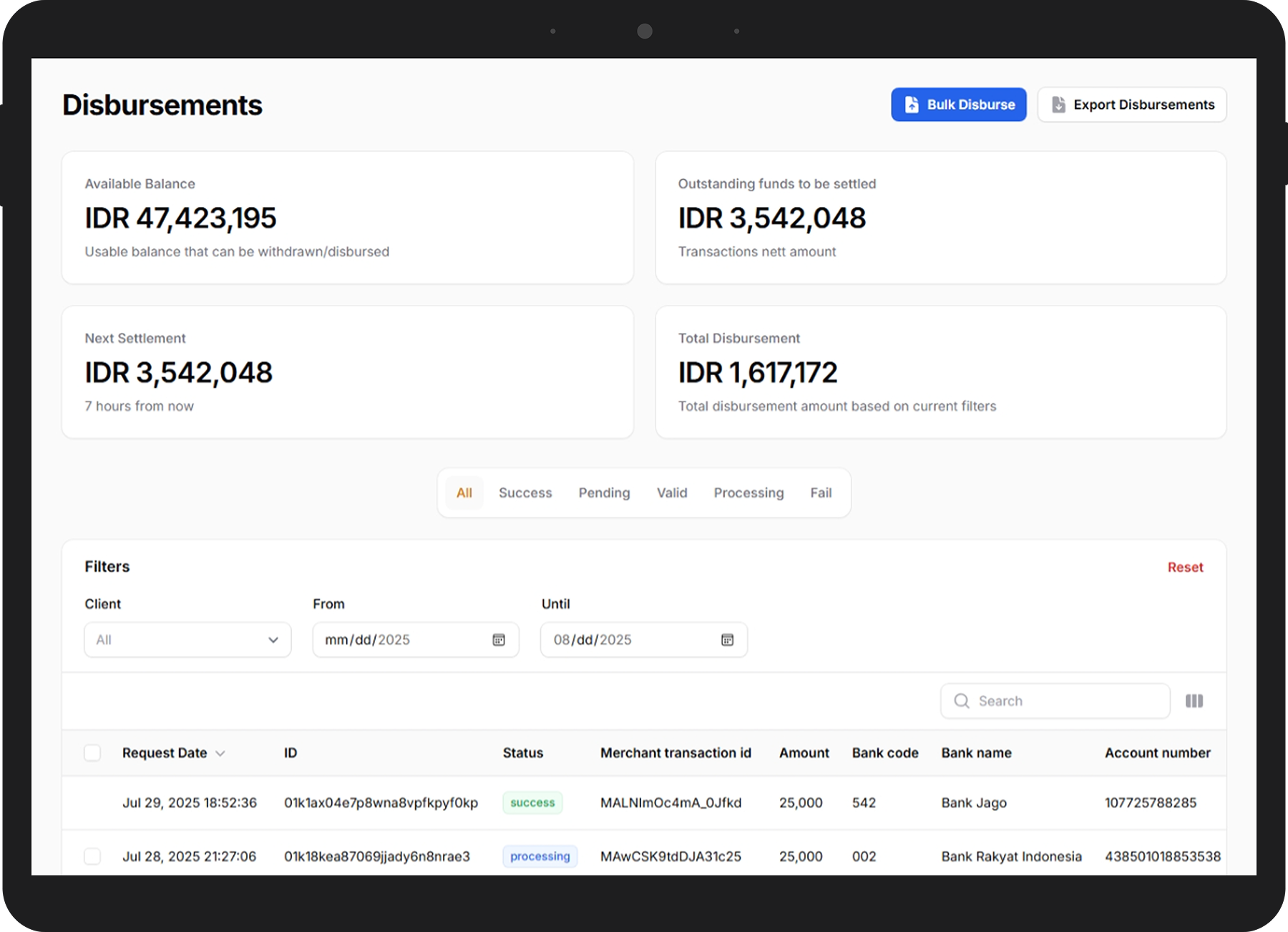 Supports all major Indonesian banks and e-wallets, with cross-border disbursement available on request.
